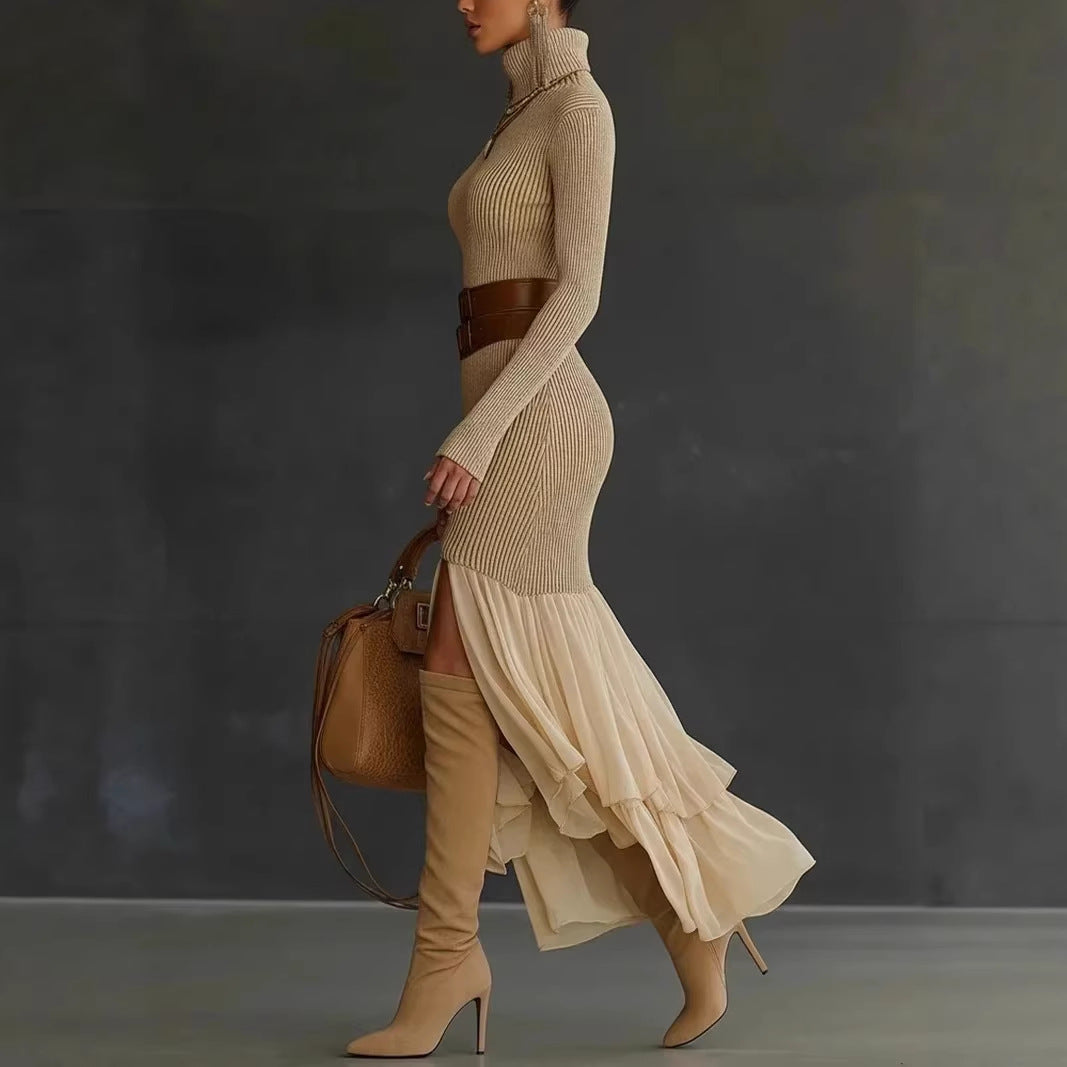 Womens High-neck Ribbed Midi Dress For Spring Autumn And Winter European And American Style